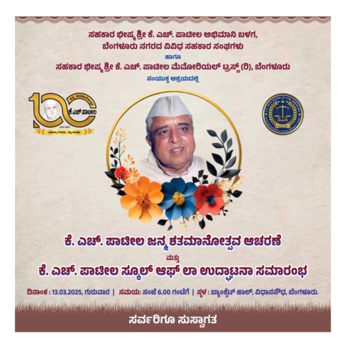 ಸಹಕಾರ ಭೀಷ್ಮ ಶ್ರೀ ಕೆ ಎಚ ಪಾಟೀಲ್ ಅಭಿಮಾನಿ ಬಳಗ, ಬೆಂಗಳೂರು ನಗರದ ವಿವಿಧ ಸಹಕಾರ ಸಂಘಗಳು ಹಾಗೂ ಸಹಕಾರ ಭೀಷ್ಮ ಕೆ ಎಚ‌ ಪಾಟೀಲ್ ಮೆಮೋರಿಯಲ್ ಟ್ರಸ್ಟ (ರಿ) ಬೆಂಗಳೂರು ಸಹಯೋಗದಲ್ಲಿ ಸಹಕಾರ ರಂಗದ ಭೀಷ್ಮ ಕೆ.ಎಚ್. ಪಾಟೀಲ ಅವರ ಜನ್ಮ ಶತಮಾನೋತ್ಸವ ಆಚರಣೆ ಮತ್ತು ಕೆ ಎಚ ಪಾಟೀಲ್ ಸ್ಕೂಲ ಆಪ ಲಾ ಉದ್ಘಾಟನಾ ಸಮಾರಂಭವು ಮಾರ್ಚ್ 06 ಸಂಜೆ 06 ಘಂಟೆಗೆ ವಿಧಾನ ಸೌಧ ಬ್ಯಾಂಕ್ವೆಟ್ ಹಾಲ್ ಜರುಗಲಿದೆ.