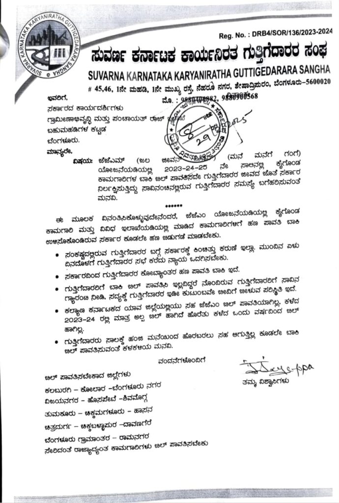 ಬೆಂಗಳೂರು :: ರಾಜ್ಯದ ಅಭಿವೃದ್ಧಿ ಮಾಡಿವುದೆ ಗುತ್ತಿಗೆದಾರರು ತಮ್ಮ ಸ್ವಂತ ಹಣ ಹಾಕಿ ಕಾಮಗಾರಿ ಮಾಡುತ್ತಾರೆ.ಮಾಡಿದ ಕಾಮಗಾರಿಗೆ ಸರ್ಕಾರ ಸರಿಯಾದ ಸಮಯಕ್ಕೆ ಬಿಲ್ಲ ಪಾವತಿ ಮಾಡದೆ ಇರುವದರಿಂದ ಗುತ್ತಿಗೆದಾರರ ಪರಿಸ್ಥಿತಿ ಅಧೋಗತ್ತ ಸಾಗುತ್ತಿದೆ ಗುತ್ತಿಗೆದಾರರು ಕಾಮಗಾರಿಗಳನ್ನು ಪೂರ್ಣ ಮಾಡಿದರು ಬಿಲ್ಲ ಆಗದೆ ಸಂಕಷ್ಟ ದಲ್ಲಿ ಇದ್ದಾರೆ ಪೂರ್ಣಗೊಳಿಸಿದ ಕಾಮಗಾರಿಯ ಹಣ ಪಾವತಿಸುವಂತೆ ಸುವರ್ಣ ಕರ್ನಾಟಕ ಗುತ್ತಿಗೆದಾರರ ಸಂಘದ ನೇತೃತ್ವದಲ್ಲಿ ವಿಧಾನಸೌಧದಲ್ಲಿ ಜೆಜೆಎಂ ಕಾಮಗಾರಿಗಳ ಬಿಲ್ಲ ನೀಡುವಂತೆ ಒತ್ತಾಯಿಸಿ ಗ್ರಾಮೀಣಾಭಿರುದ್ಧಿ ಮತ್ತು ಪಂಚಾಯತ್ ರಾಜ್ ಇಲಾಖೆಯ ಸರ್ಕಾರದ ಕಾರ್ಯದರ್ಶಿ ಸಮೀರ್ ಶುಕ್ಲಾ ಅವರಿಗೆ ಮನವಿ ಪತ್ರ ಸಲ್ಲಿಸಿದ್ದರು